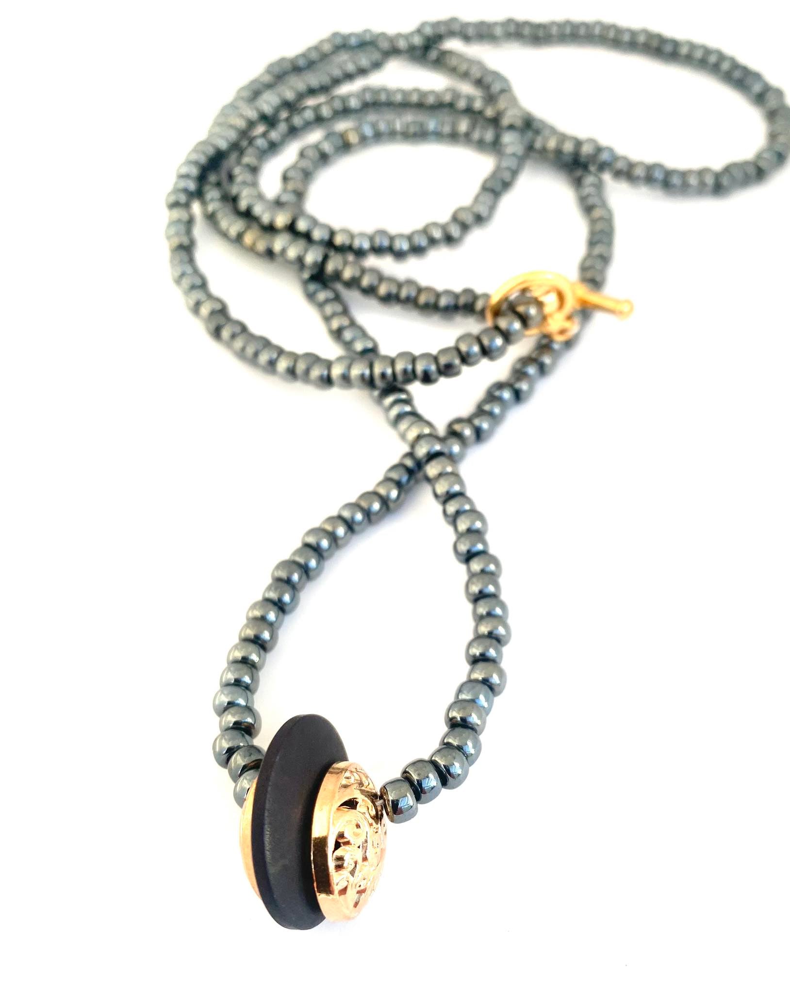Hæst móðins perlufesti, blá, gyllt og svört. Lengd ca. 100 cm.